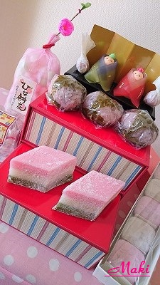 今日はひな祭りパーティしました。 もちろん、これで(笑)↓ 母からの差し入れ 和菓子のお雛様 かわいー